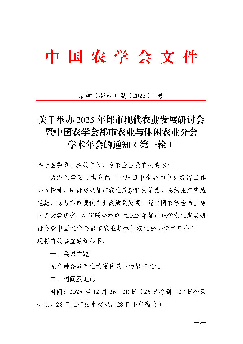 关于举办2025年都市现代农业发展研讨会暨中国农学会都市农业与休闲农业分会学术年会的通知(第一轮)